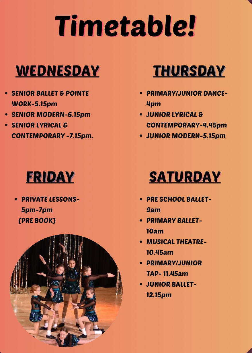 With qualified and professional teaching and staff, we provide classes such as Ballet, Tap, Jazz, Modern, Lyrical, Contemporary, Commercial, Acro, Musical Theatre, Dance Fitness and Mum and Baby classes.